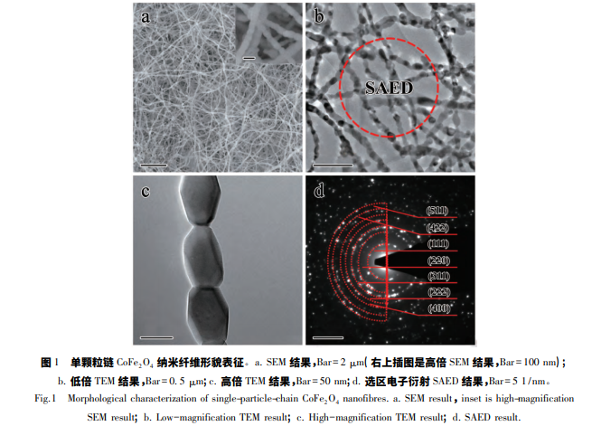 經(jīng)過 900 ℃高溫退火處理的 CoFe2O4 納米纖維 首先進(jìn)行了 SEM( 掃描電子顯微鏡) 和 TEM( 透射電 子顯微鏡) 形貌觀察及表征,圖 1a 是典型的低倍 SEM 結(jié)果,從圖中可以清晰地看到,納米纖維具有 連續(xù)的結(jié)構(gòu),具有很大的長徑比,右上高倍數(shù)下的 SEM 結(jié)果插圖以及圖 1c 中的 TEM 結(jié)果均證明了單 根納米纖維由具有均勻尺寸的納米顆粒沿著纖維 的長軸一一堆垛連接而成,單個(gè)顆粒平均直徑為 60 nm( 55 nm ~ 65 nm) 。圖 1b 是低倍 TEM 結(jié)果,可見 在更高的放大倍數(shù)下,納米纖維同樣均勻地分布在 微柵支持膜上,具有均勻的尺寸。選擇紅色圓圈所 示的區(qū)域做選區(qū)電子束衍射( SAED) ,結(jié)果如圖 1d 所示,得到的衍射花樣是由衍射斑點(diǎn)構(gòu)成的同心衍 射環(huán),這其中包含了( 111) 、( 220) 、( 311) 、( 222) 、 ( 400) 、( 422) 和( 511) 晶面,證明了大范圍 CoFe2O4 納米纖維是面心立方的多晶結(jié)構(gòu)。