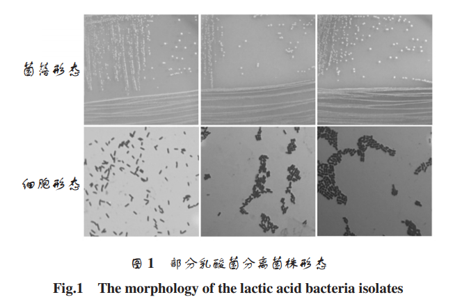 從 5 份恩施州咸豐地區(qū)鲊廣椒中一共分離出 44 株細(xì)菌。在厭氧工作站經(jīng)含有碳酸鈣的 MRS 培養(yǎng)基中 培養(yǎng)后,將觀察到菌落的周圍存在透明圈,革蘭氏染 色呈陽性,且過氧化氫酶試驗呈陰性的菌株初步確定 為乳酸菌,共有 20 株,將它們進行純化與保存。部分 乳酸菌的菌落與細(xì)胞形態(tài)見圖 1。