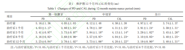 所有患者需要首先完善牙周基礎(chǔ)治療,并進(jìn)行 口腔衛(wèi)生宣教,對(duì)于同時(shí)伴發(fā)牙周牙髓聯(lián)合病變的患牙酌情 適時(shí)的進(jìn)行根管治療,然后分別于治療后的1、3、6、12個(gè)月 復(fù)查,使用牙周探針記錄治療前及復(fù)查時(shí)所有天然牙(除第 三磨牙外)各項(xiàng)檢查指標(biāo)的數(shù)值,包括PD、CAL和TM,同時(shí)予 以 Air-Flow Master 噴砂系統(tǒng)、Perio-Flow 砂粉(瑞士 EMS 公司)進(jìn)行齦下噴砂,并記錄患者的疼痛值(0為無痛,1~3 為輕度疼痛,4~6 為中度疼痛,7~9 為重度疼痛,10 為劇 痛),再次進(jìn)行口腔衛(wèi)生宣教。其中PD和CAL的檢查位點(diǎn)為頰近中、頰正中、頰遠(yuǎn)中、舌近中、舌正中和舌遠(yuǎn)中共6個(gè)位 點(diǎn)。所有檢查均由同一位醫(yī)生完成。