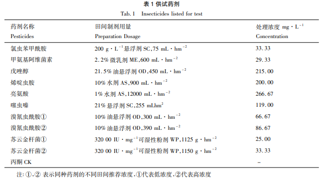 本試驗(yàn)所用藥劑均由浙江大學(xué)農(nóng)藥與環(huán)境毒理研究所提供,其中氯蟲苯甲酰胺、烯啶蟲 胺、噻蟲嗪、溴氰蟲酰胺為目前水稻蟲害防治上推薦使用的高效化學(xué)殺蟲劑; 戊唑醇為水稻病害高效殺菌 劑; 甲氨基阿維菌素、亮氨酸和蘇云金桿菌為目前較高效的生物殺蟲劑( 表 1) 。