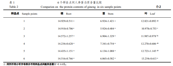 試驗(yàn)結(jié)果表明,6 個(gè)采樣點(diǎn)間人參根和莖的蛋白 含量無顯著差異,而 6 個(gè)采樣點(diǎn)間葉部蛋白質(zhì)含量差 異顯著,可能是由于葉片為采樣時(shí)期的主要生長組織, 各植株生長狀態(tài)有所不同,也可能是光照等環(huán)境因素 造成的;而任一組內(nèi)蛋白質(zhì)含量個(gè)體之間無顯著差異; 但同一人參樣品的根、莖、葉間存在顯著差異。