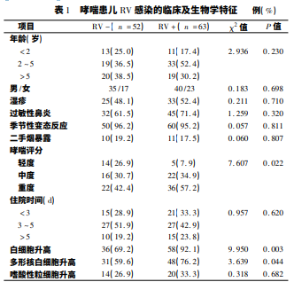 本研 究共納入了 115 例哮喘兒童,有濕疹 58 例( 50. 4% ) ,有過(guò)敏性鼻炎 77 例( 67. 0% ) ,有季節(jié)性變態(tài)反應(yīng) 110 例( 95. 7% ) ; 根據(jù) PAS 評(píng)分有 19 例( 16. 5% ) 患兒為 輕度 哮 喘,38 例 ( 33. 1% ) 患兒為中度哮喘,58 例 ( 50. 4% ) 患兒為重度哮喘。鼻病毒陽(yáng)性( RV + ) 患兒 63 例 ( 54. 8% ) ,鼻 病 毒 陰 性 ( RV - ) 患 兒 52 例 ( 45. 2% ) 。RV + 哮喘患兒與 RV - 哮喘患兒在年齡、 性別、濕疹、過(guò)敏性鼻炎、季節(jié)性變態(tài)反應(yīng)、二手煙暴露 等方面差異無(wú)統(tǒng)計(jì)學(xué)意義( P > 0. 05) 。2 ~ 5 歲兒童 急性哮喘發(fā)作中 RV + 患病率最高,占52. 4% ,< 2 歲 兒童急性哮喘發(fā)作中 RV + 患病率最低,占 17. 4% 。 RV + 哮喘患兒與 RV - 哮喘患兒在哮喘評(píng)分、白細(xì)胞 升高、多形核白細(xì)胞升高等方面差異有有統(tǒng)計(jì)學(xué)意義 ( P < 0. 05) 。見(jiàn)表 1。