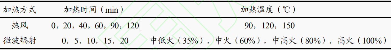 選取新鮮成熟的浙江省普通油茶籽。分別采用熱風(fēng)式烘箱和微波爐等對(duì)油茶籽進(jìn)行熱風(fēng)和微波輻射等兩種形式的加熱處理,加熱結(jié)束后自然冷卻至室溫后剝殼,冷藏備用。兩種加熱方式及加熱條件,實(shí)驗(yàn)所用加熱方式及條件見表1。