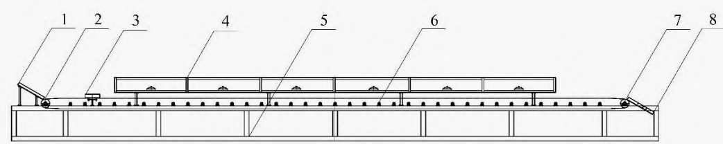 1. 進(jìn)料口2. 輸送帶3. 厚度限制裝置4. 射頻箱體5. 底部支架6. 電加熱裝置7. 輥輪8. 出料口